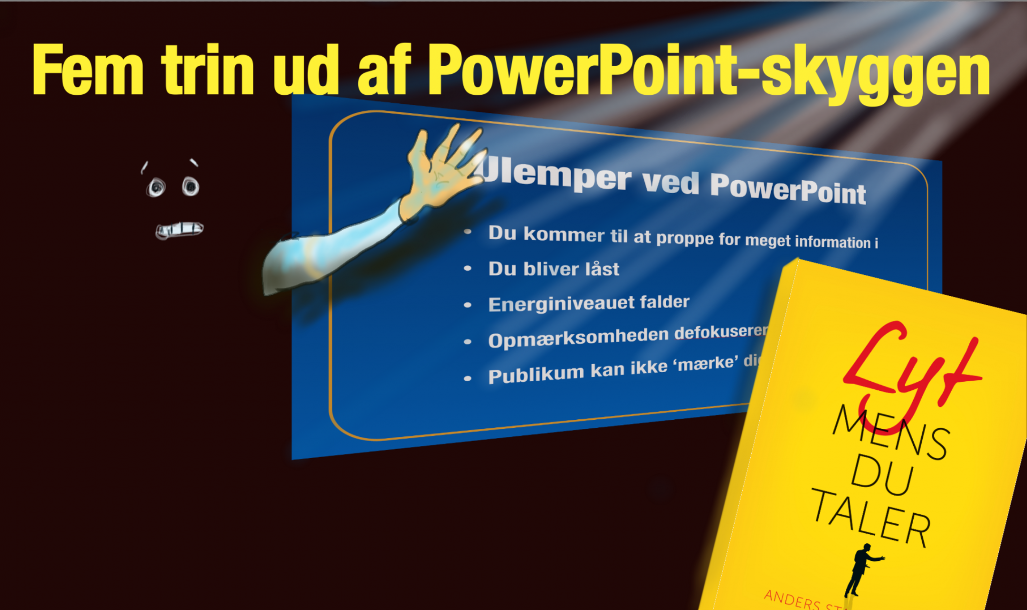 Jeg møder tit personer, der føler sig låst af PowerPoint og som gerne være i bedre kontakt med publikum. Dilemmaet er, at PowerPoint giver en følelse af tryghed. Det er blevet ‘sådan man gør’. At tale uden slides virker usikkert, ‘nøgent’. Men det er jo netop pointen: At man gemmer sig, når man bruger projektor. Så hvordan springer man ud i det, hvis man vil tage en PowerPoint-detox?