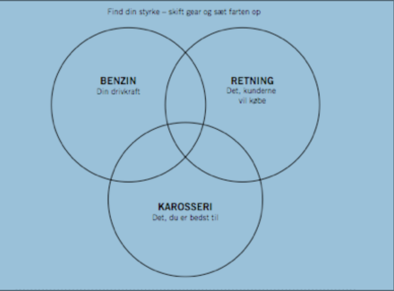 Skærmbillede 2015-10-01 kl. 16.22.53Vi arbejder med at du genopdager og afdækker 1) din passion og drivkraft, 2) dine spidskompetencer og 3) dine markeds-­ og erhvervsrettede kompetencer. De tre områder afdækkes og foldes ud ved hjælp af en række redskaber, herunder anerkendende spørgeteknik, din og vores indsigt i det relevante marked, brug af dit og vores netværk mv. Du arbejder med at se på dine kompetencer, din passion og de konkrete muligheder ­‐ og give dem mening. Vi kombinerer de tre dimensioner på nye måder mhp. konkrete job- eller innovationsmuligheder. En proces, som i sig selv er meget energigivende for dig. Processen afsluttes med en handleplan, som passer dig.