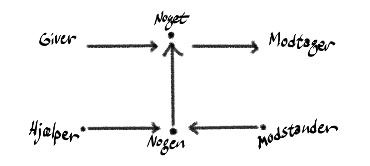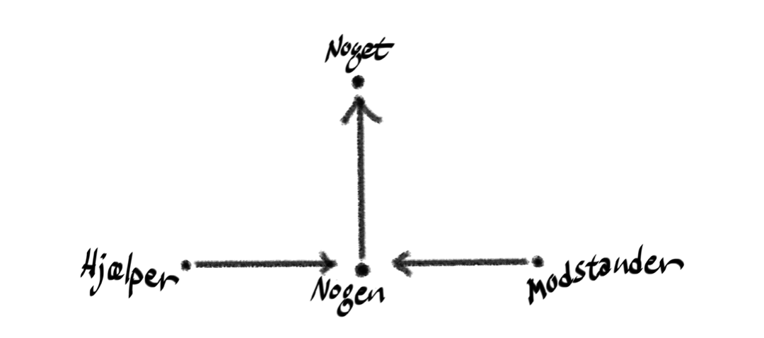 Når vi arbejder med at forstærke og forædle historier ved hjælp af aktantmodellen, kan vi sagtens undlade at beskæftige os med giver og modtager. De fire andre aktører (nogen, noget, modstander og hjælper) er til gengæld vigtige at kigge nærmere på. Betragt dem som knapper, du kan skrue op for. Hvordan kommer vi til nu.
